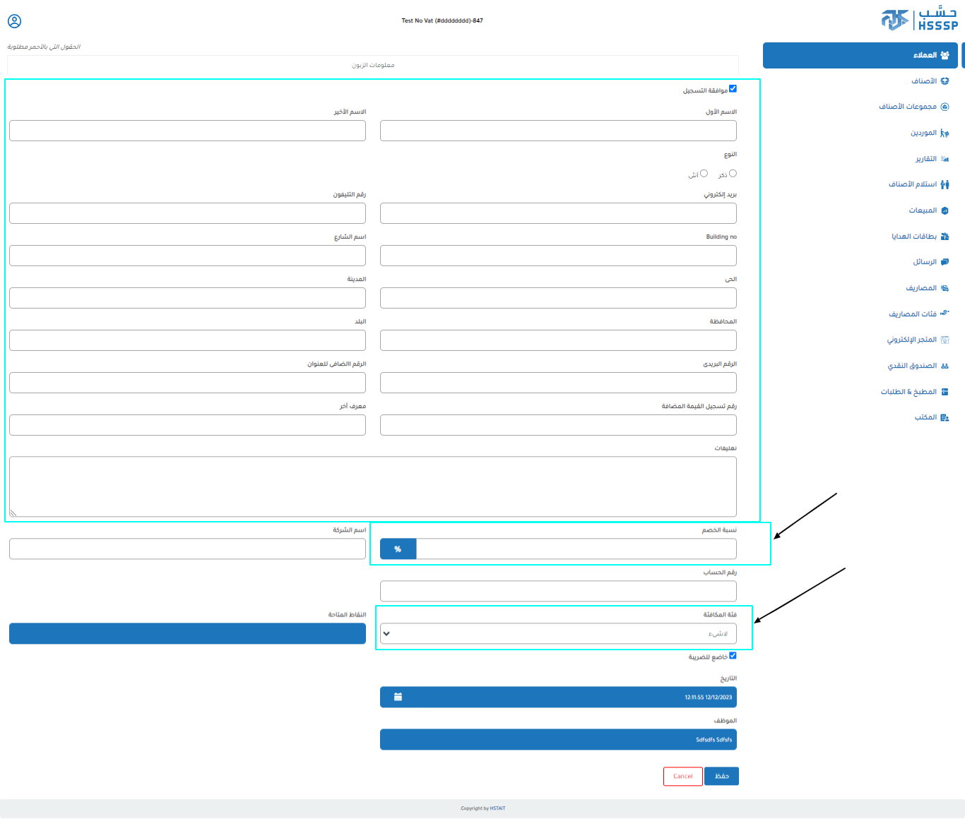 الرقم الضريبي ( يمكنك عمل نسبة خصم للعميل اختيار نقاط