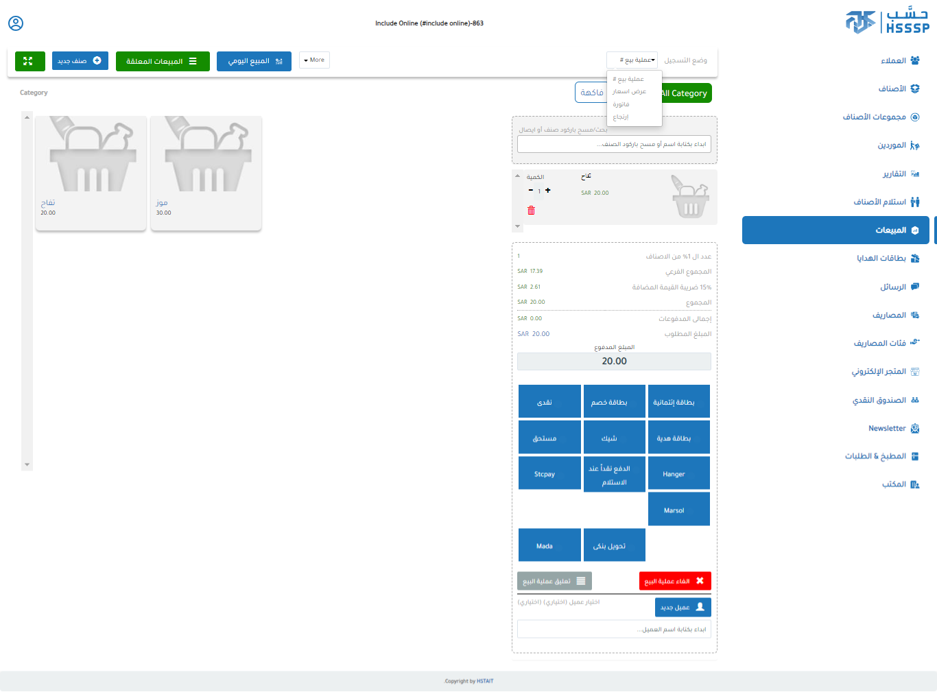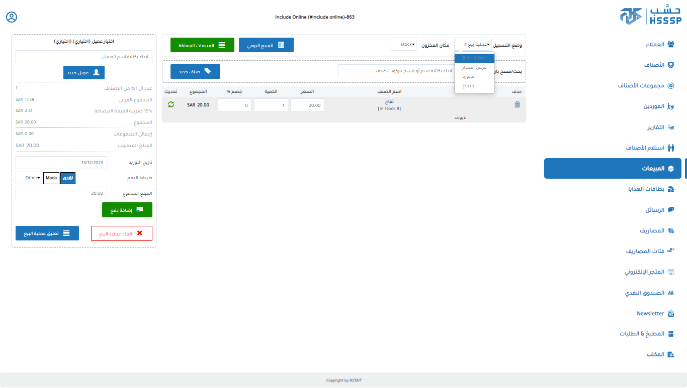 من هنا يمكنك إضافة أو إنشاء الدفع والبيع ، يمكنك استخدام نقاط البيع الخاصة بك من هنا إنشاء فاتورة أو إيصال في وضع محترم إلى العميل أو العملاء